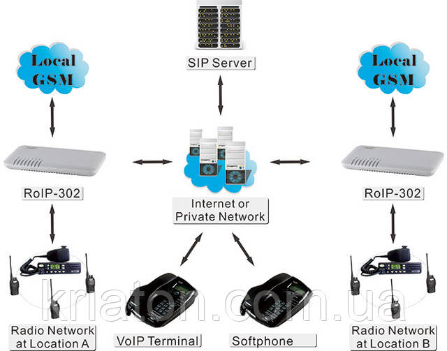 На малюнку показана проста схема організації зв'язку, коли через інтернет взаємодіють два шлюзу RoIP-102, кожен з яких з'єднаний зі своїм ретранслятором. При цьому «радиоабоненты» групи А та групи В можуть спілкуватися кожен з кожним.